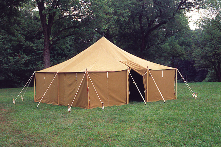 Traditionally used as first aid stations, mobile hospitals, construction offices or temporary living quarters, the International Pyramidal Tent can serve a multitude of shelter needs. Split corners allow for wall roll ups. Heavy duty construction includes guy ropes, wooden poles and tough, Army Khaki Cotton Duck fabric.
